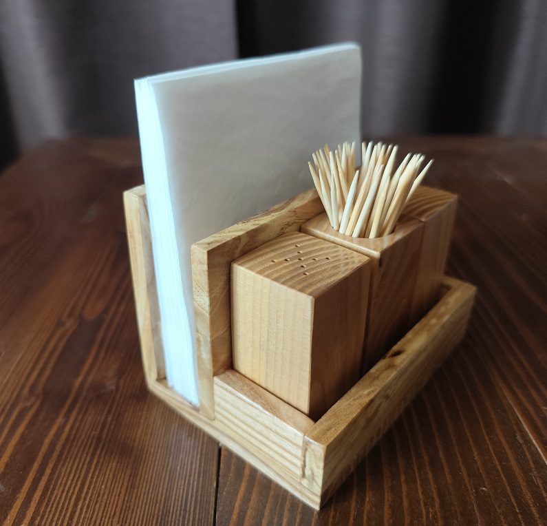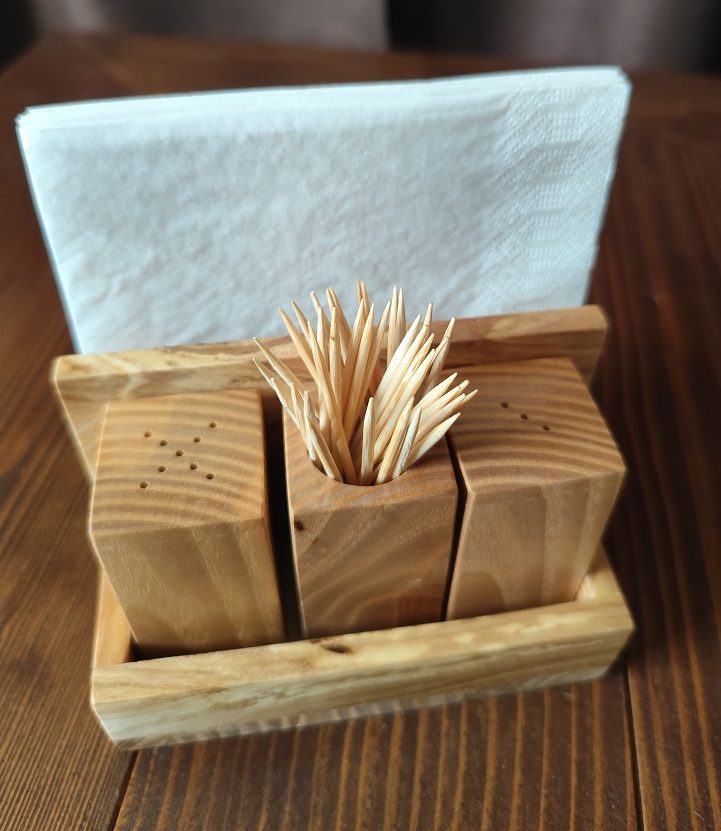 Oša koka salvešu turētājs ar garšvielu trauciņiem
